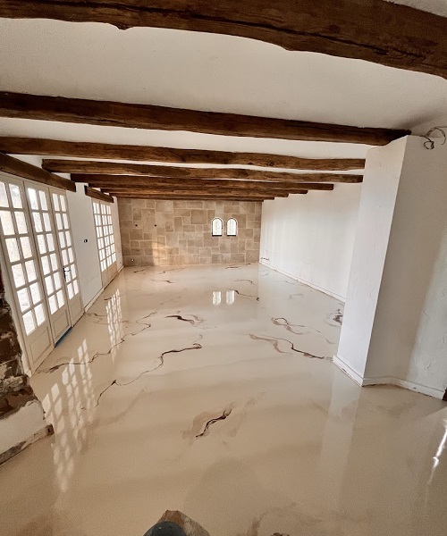 Le sol est préparé avec soin (nettoyage, ponçage, réparations si nécessaires) afin d’assurer une adhérence optimale de la résine et un rendu final durable et impeccable.